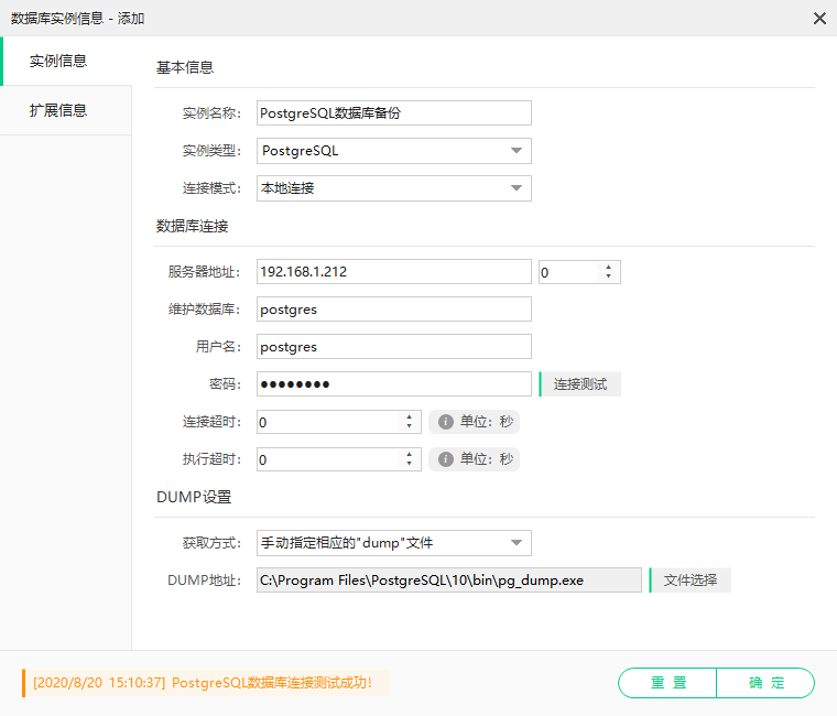 当实例管理 | 实例信息中实例类型选择 PostgreSQL 时,数据库连接和DUMP设置的相应配置方法如下。