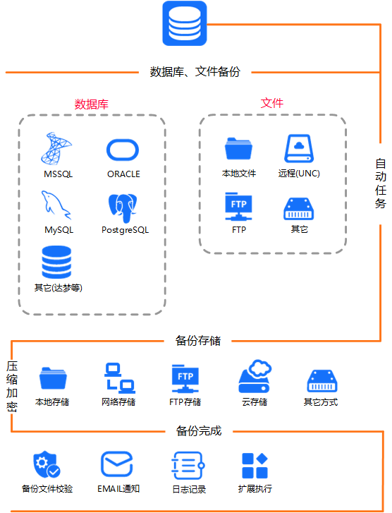 在任意计算机上安装备份客户端,即可备份本机的数据库、文件。可将备份文件存储在本地,也可通过网络(NAS、SMB)、FTP、SFTP、阿里云、私有云存储等方式进行异地化存储容灾。